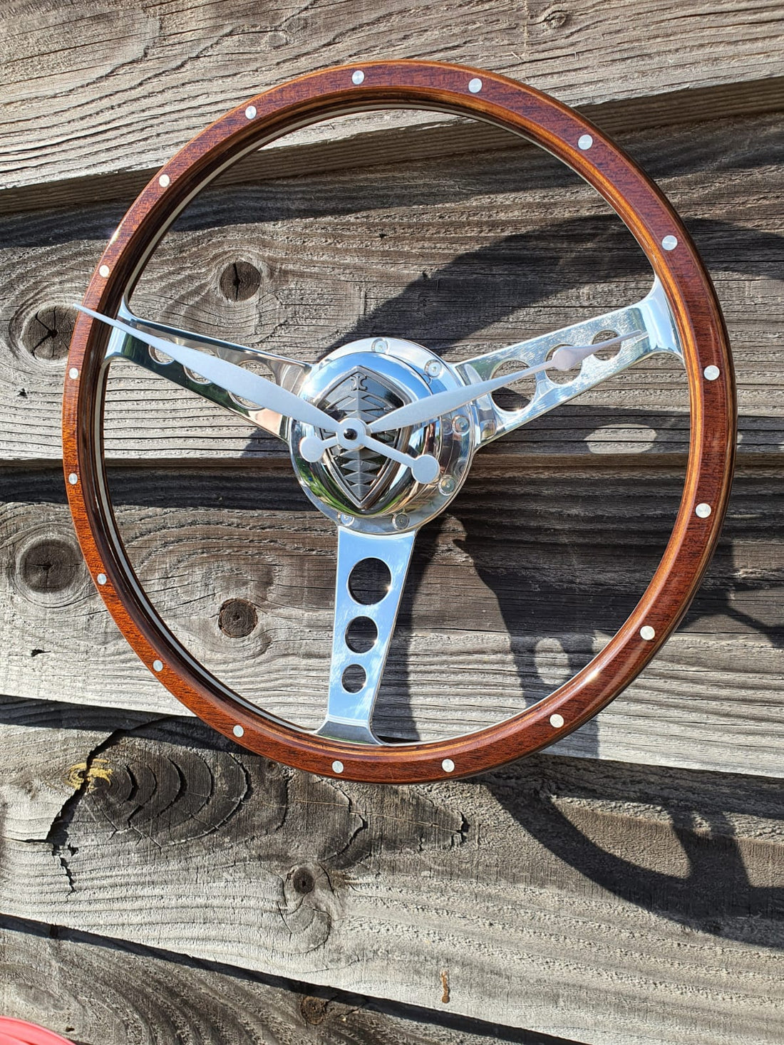 Classic car polished wooden steering wheel clock. Customers choice of car badge.