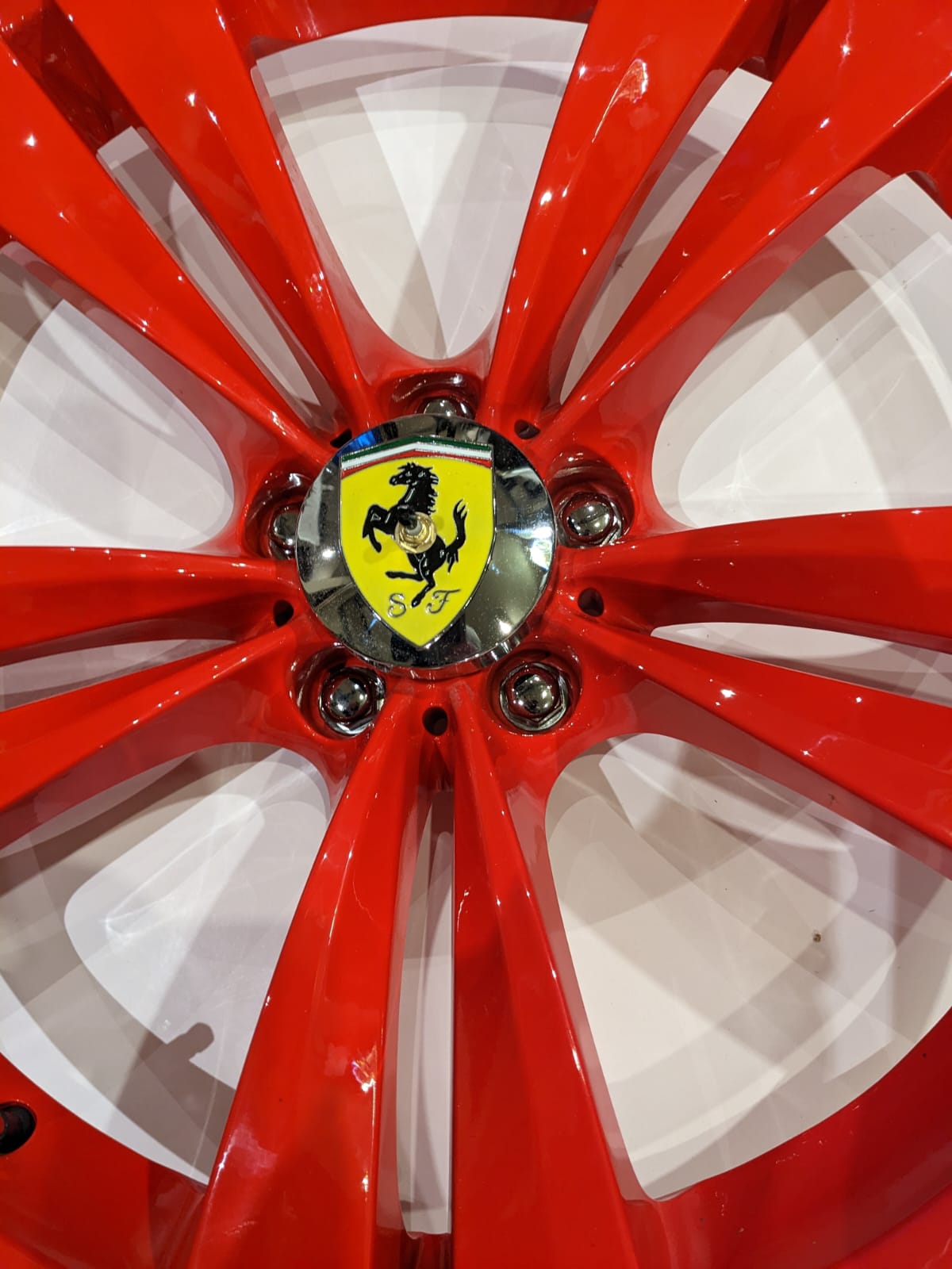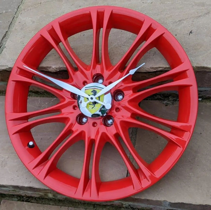 This genuine alloy wheel has been expertly cut down, refinished, and resprayed to create a stunning wall clock. Featuring a beautiful Ferrari badge and finished in iconic Ferrari red, it makes a truly unique statement piece.