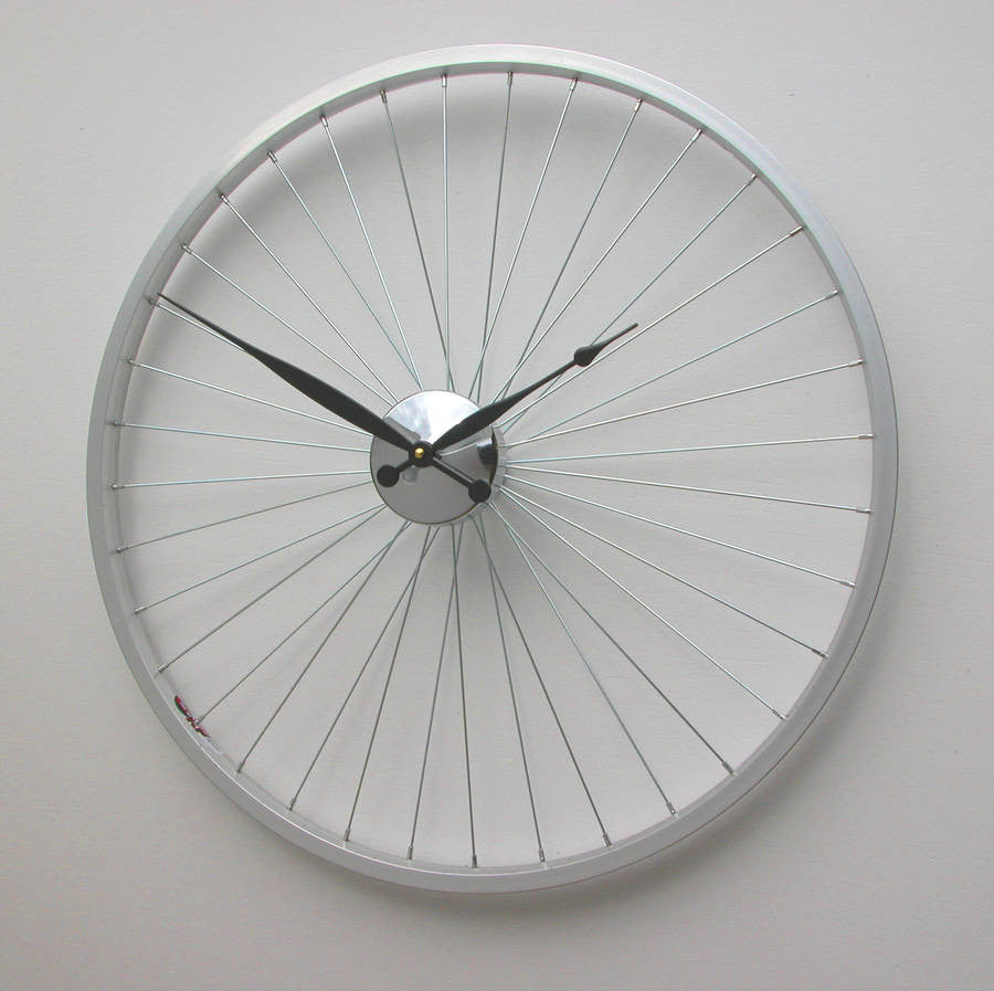 This is a reengineered bicycle wheel transformed into a beautiful wall clock.The clock mounts directly to the wall through the centre of the wheel.This truly is a unique gift and becomes the centre of attention in any room it is hung in.